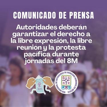 La Red Nacional de Defensoras de Derechos Humanos en México llama a autoridades a garantizar el derecho a la libre expresión, la libre reunión y la protesta pacífica durante jornadas del 8M